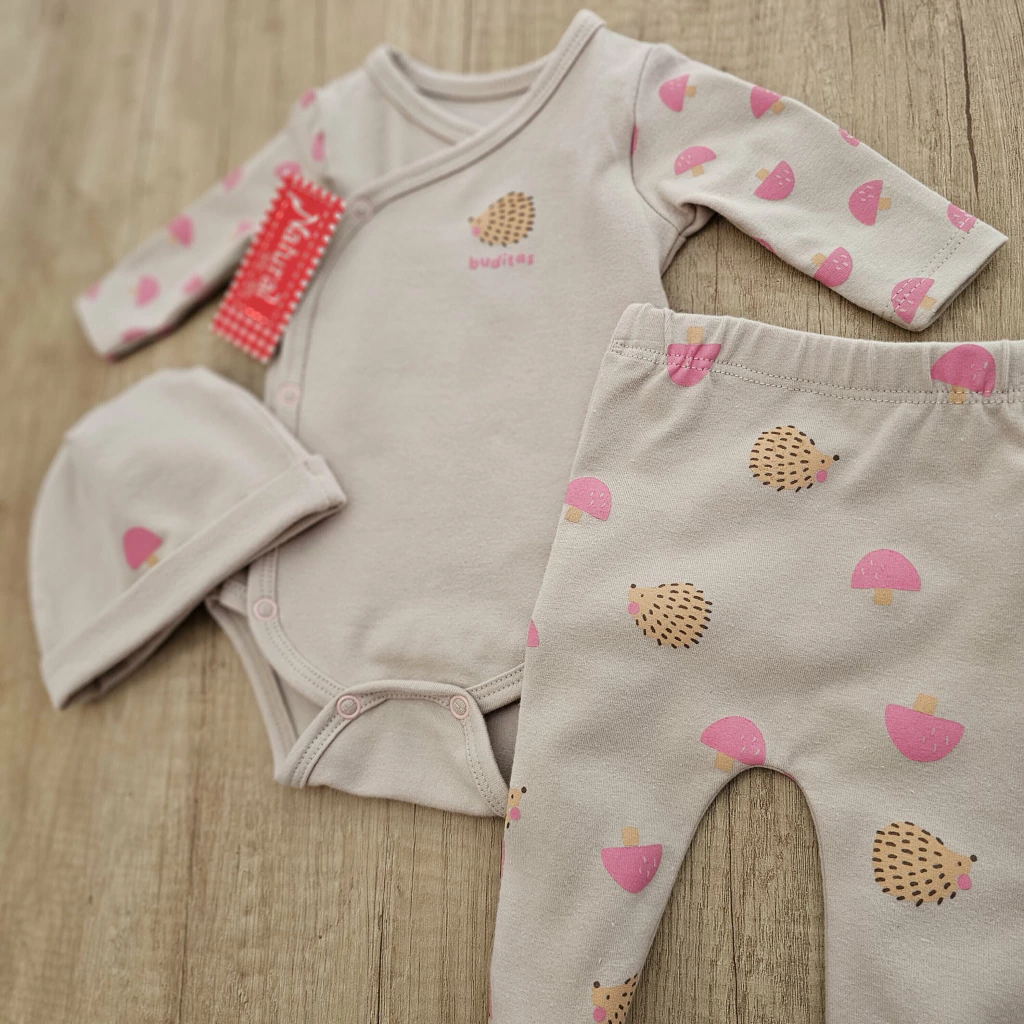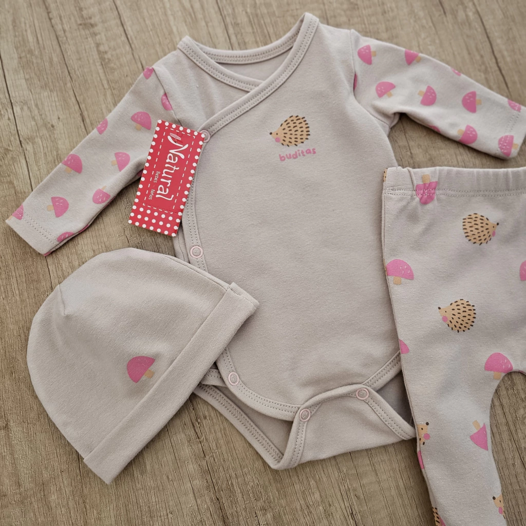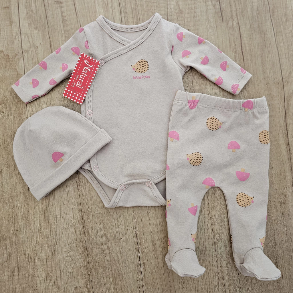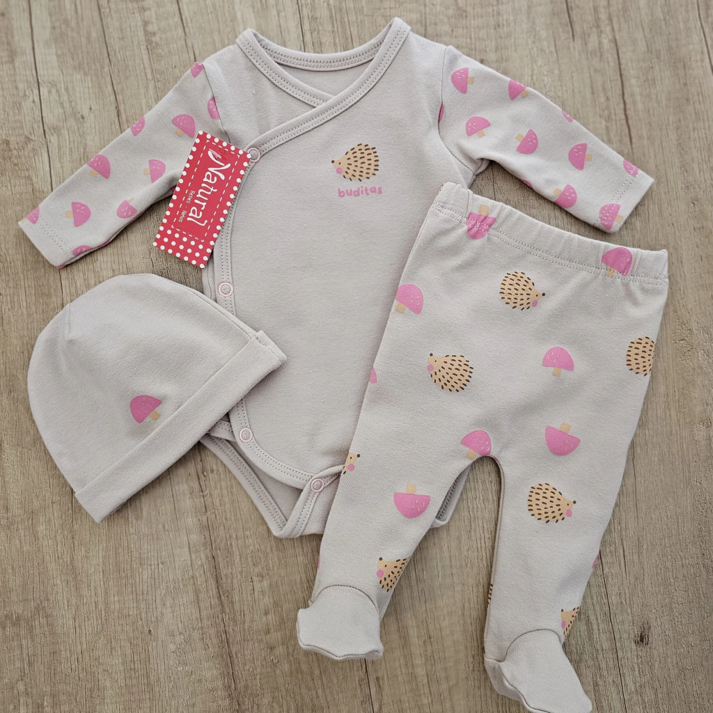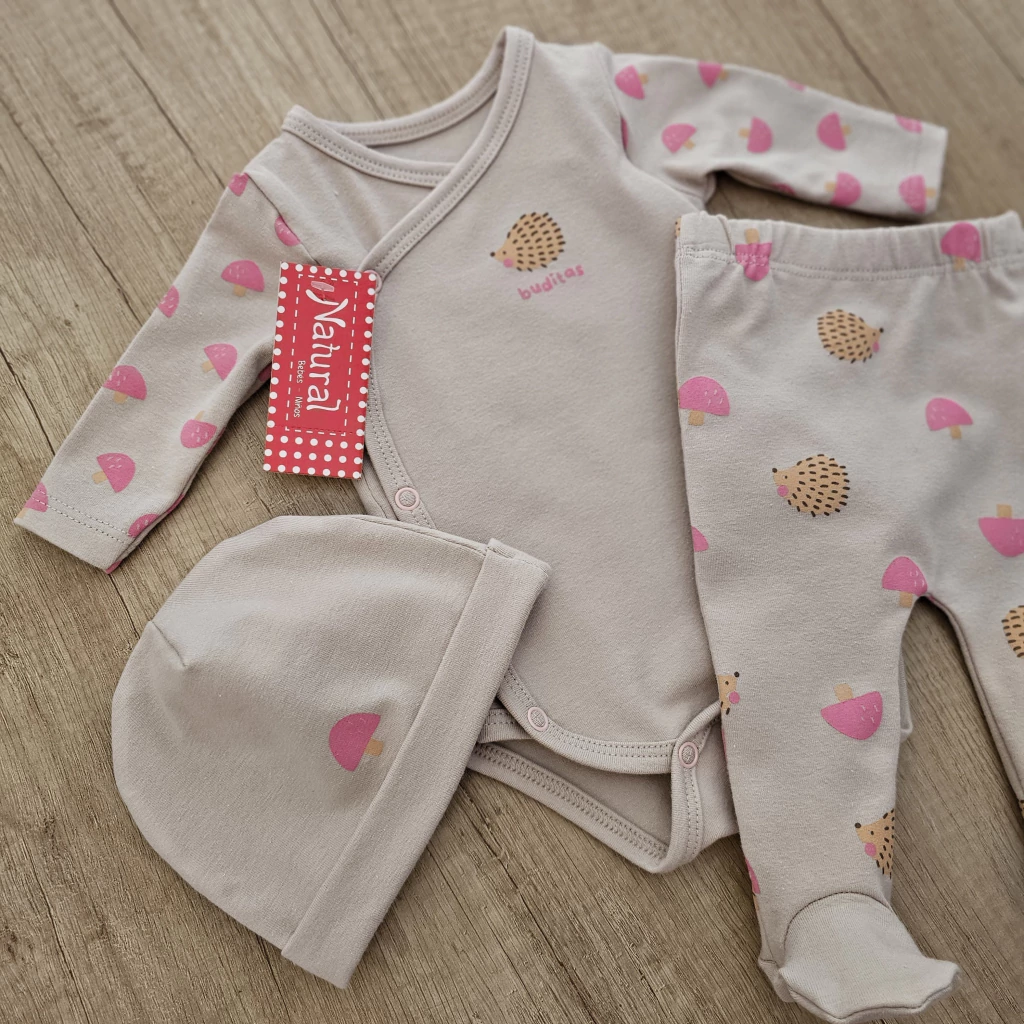 AJUAR 3 PIEZAS CONFECCIONADO EN TELA DE ALGODÓN CON LYCRA DE PRIMERA CALIDAD, CUENTA CON BODY CON BROCHES EN PARTE DELANTERA, BROCHE INTERNO Y EN ENTREPIERNA, TIERNA ESTAMPA DE ERIZO Y HONGUITOS EN MANGA, RANITA CON MISMA ESTAMPA Y GORRITO, LE PRENDA IDEAL PARA LOS PRIMEROS DIAS DEL BEBÉ. TE INVITAMOS A RECORRER NUESTRO SHOP DONDE VAS A ENCONTRAR GRAN VARIEDAD DE PRENDAS PARA COMPLETAR EL LOOK.