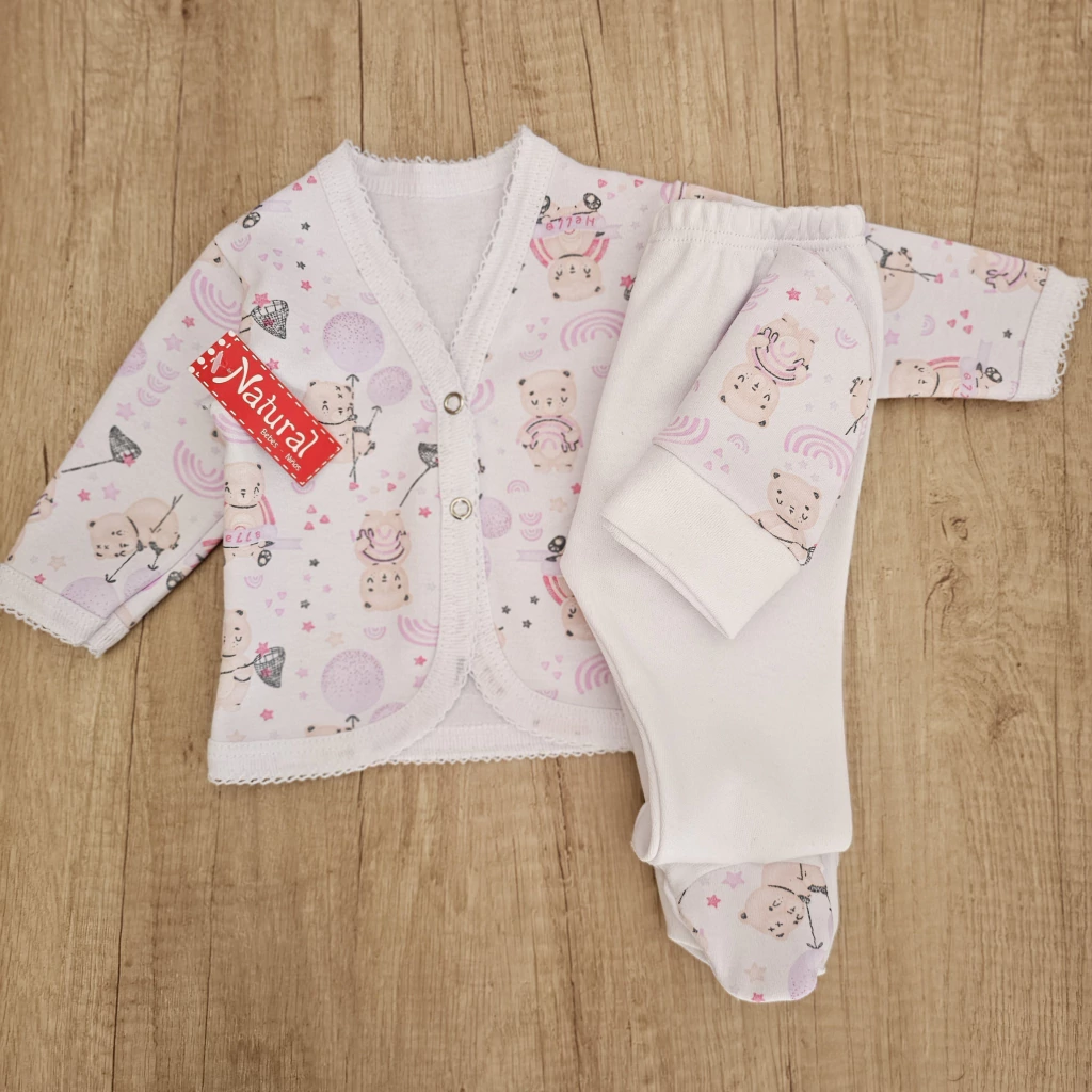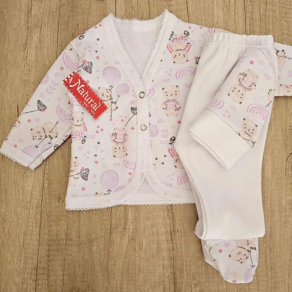 Este hermoso ajuar está confeccionado en tela de algodón de primera calidad, suave y delicada para la piel de tu bebé. El conjunto incluye una batita estampada con broches delanteros y detalle de picot, una ranita y gorro. Ideal para la salida de sanatorio o los primeros días de tu BEBÉ.