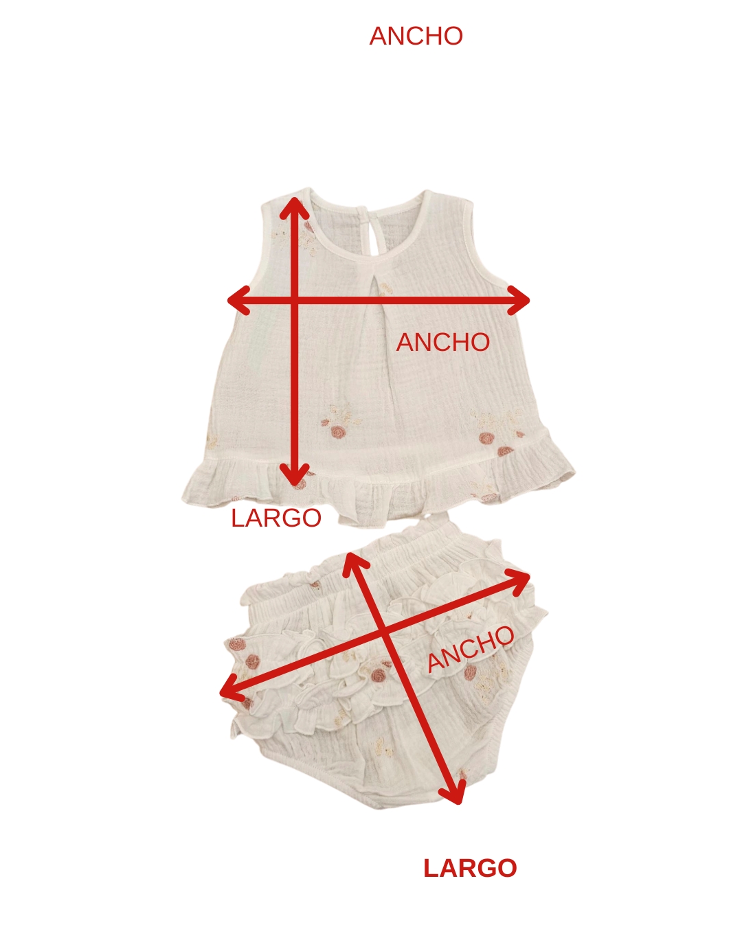 CONJUNTO CONFECCIONADO EN BABY COTTON DE PRIMERA CALIDAD, POSEE BLUSA CON DETALLE DE VOLADITO Y BOTÓN EN ESPALDA, BOMBACHÓN CON CINTURA ELASTIZADA, VOLADO EN PARTE TRASERA, AMBOS CON ENCANTADOR BORDADO DE ROSITAS, SUAVE Y DELICADO PARA LA PIEL DEL BEBÉ. TE INVITAMOS A RECORRER NUESTRO SHOP DONDE VAS A ENCONTRAR GRAN VARIEDAD DE PRENDAS PARA COMPLETAR EL LOOK.