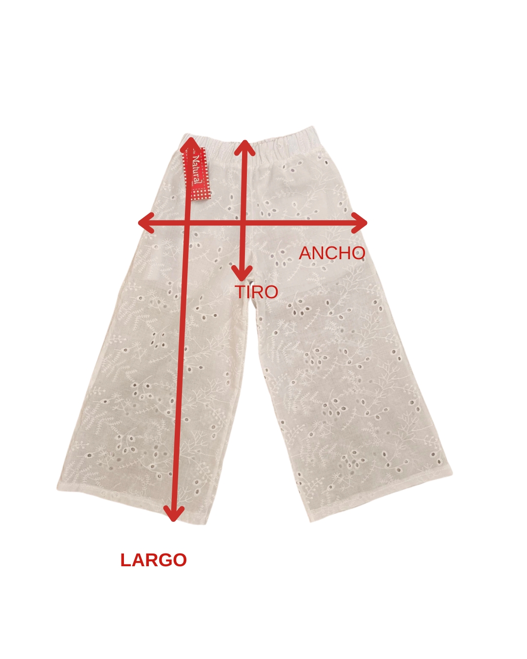 PANTALÓN PALAZZO CONFECCIONADO EN TELA DE BRODERIE DE PRIMERA CALIDAD, POSEE ELÁSTICO EN CINTURA, CALCE AMPLIO Y CÓMODO. FORRERIA EN FORMA DE SHORT. TE INVITAMOS A RECORRER NUESTRO SHOP DONDE VAS A ENCONTRAR GRAN VARIEDAD DE PRENDAS PARA COMPLETAR EL LOOK.