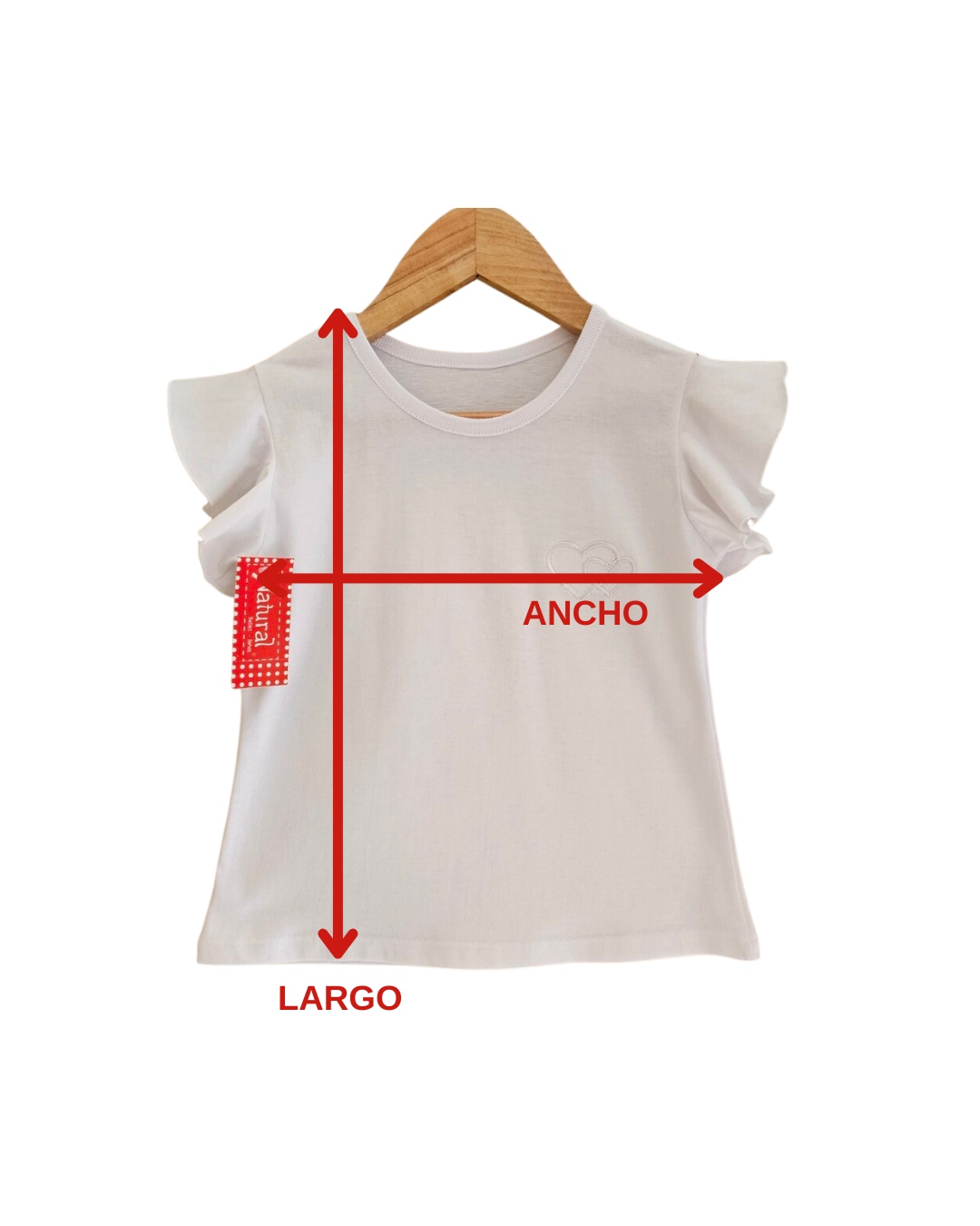REMERA CONFECCIONADA EN TELA DE ALGODÓN DE PRIMERA CALIDAD, POSEE DETALLE DE VOLADOS EN SISA, CORAZÓN BORDADO, SUPER FRESCA LA PRENDA IDEAL PARA ESTA TEMPORADA PRIMAVERA-VERANO.TE INVITAMOS A RECORRER NUESTRO SHOP DONDE VAS A ENCONTRAR GRAN VARIEDAD DE PRENDAS PARA COMPLETAR EL LOOK.