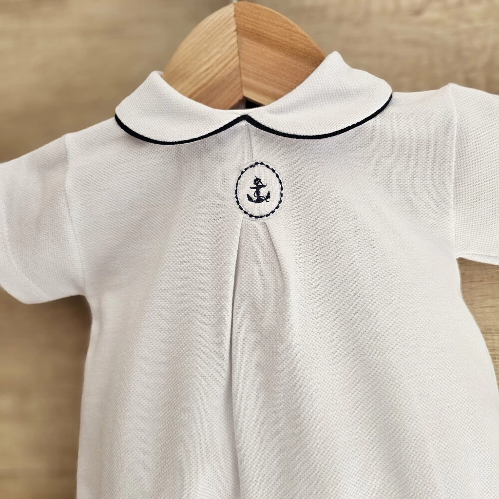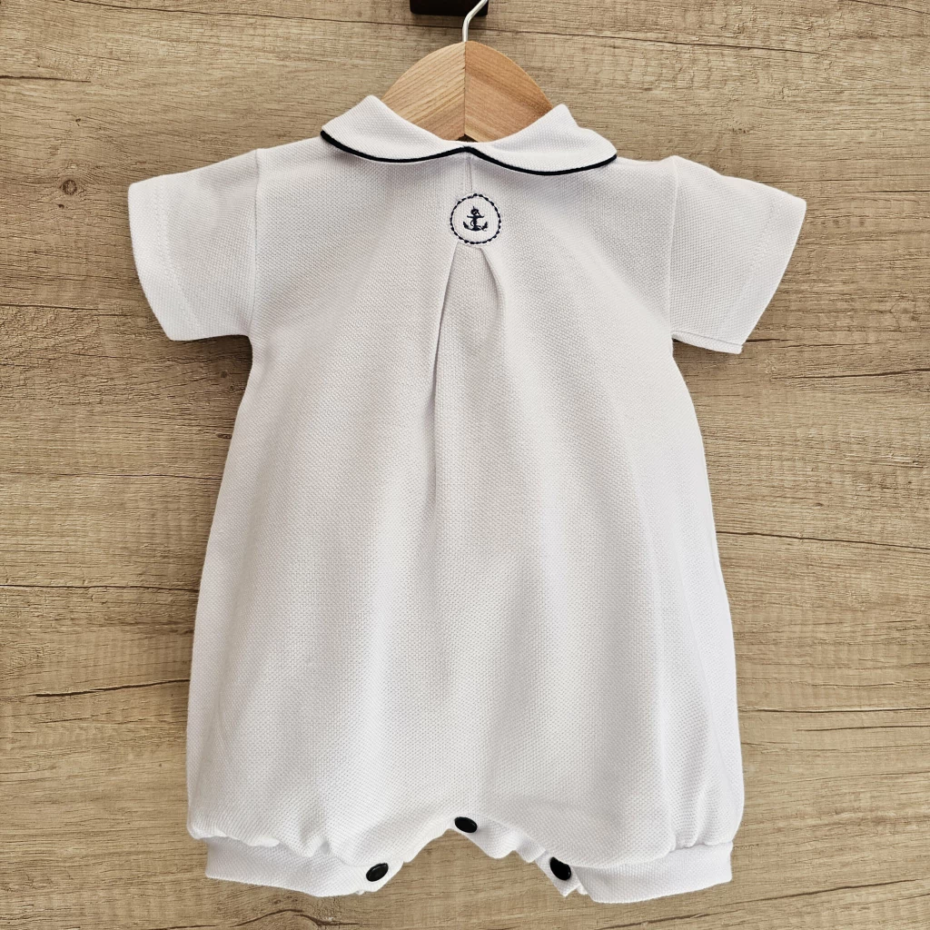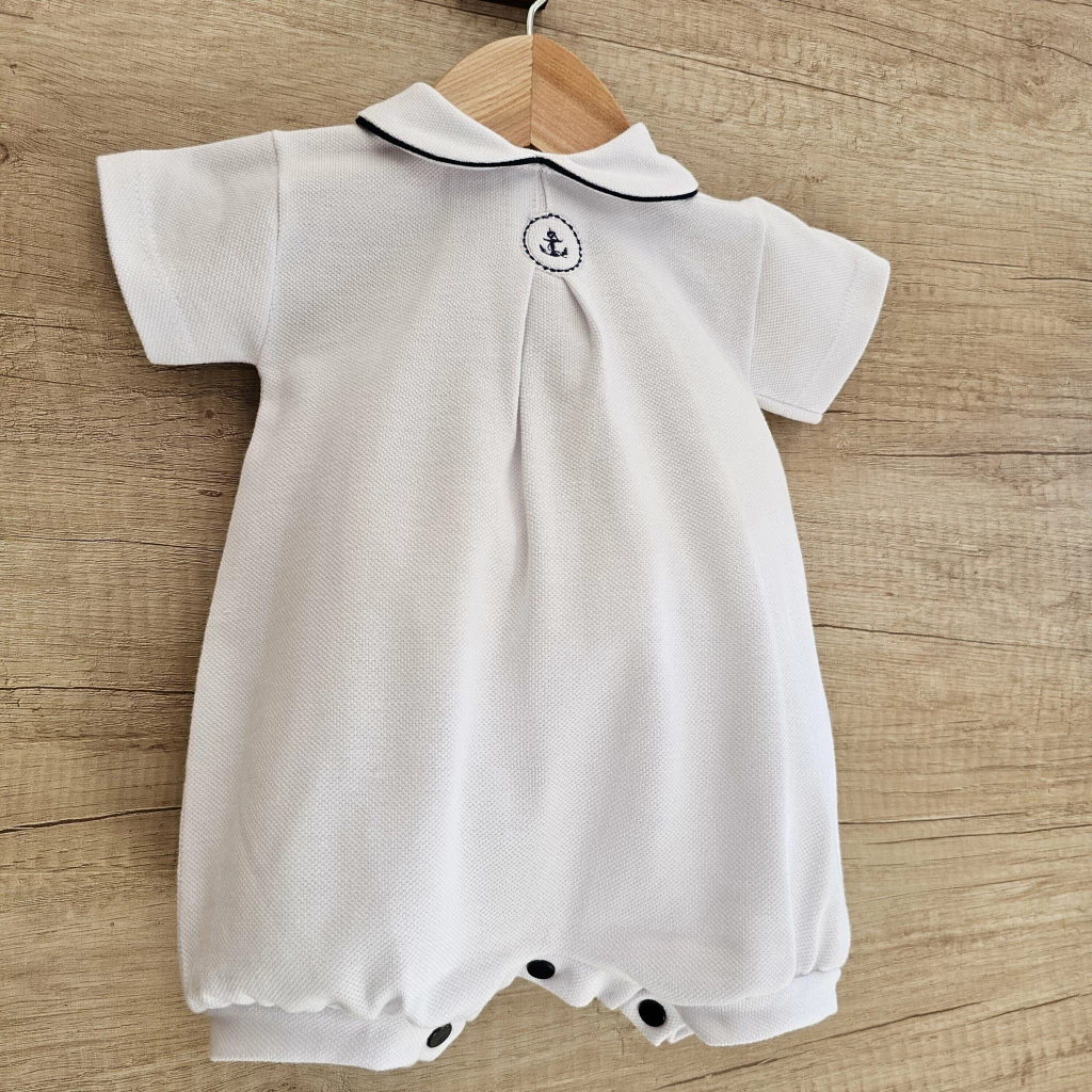 ROMPERS CONFECCIONADO EN TELA DE PIQUE DE PRIMERA CALIDAD, POSEE DETALLE DE BORDADO MARINO, SUPER DELICADO, CUELLO CON DETALLE DE BORDE AZUL, BROCHES AL TONO EN ESPALDA Y ENTREPIERNA PARA FACILITAR EL CAMBIADO. NOS ENCANTA PARA FOTOGRAFIA NEW BORN , NACIMIENTO Ó BAUTISMO.