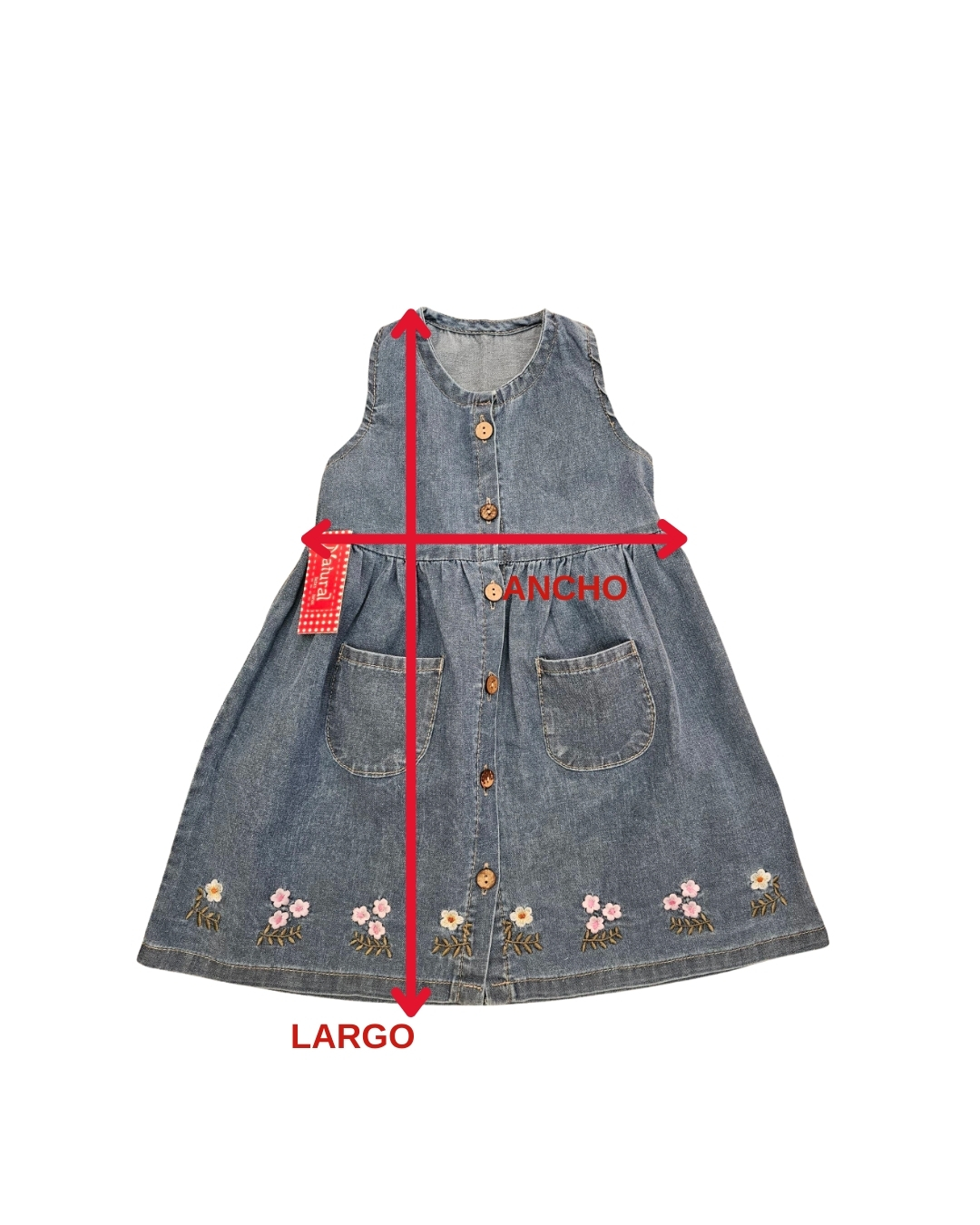 VESTIDO SIN MANGAS CONFECCIONADO EN TELA JEAN LIVIANO DE PRIMERA CALIDAD , POSEE BOTONES DE COCO EN PARTE DELANTERA, BOLSILLOS Y DELICADO BORDADO DE FLORES EN FALDA. TE INVITAMOS A RECORRER NUESTRO SHOP DONDE VAS A ENCONTRAR GRAN VARIEDAD DE PRENDAS PARA COMPLETAR EL LOOK.
